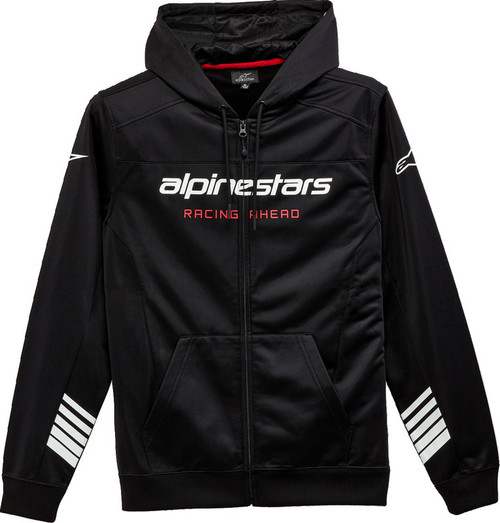 Hooded zip-front 100% polyester fleece with contrast panels Mesh lined hood, tech draw cords, rib cuffs and hem Alpinestars word logo and graphics on chest and arms Internal main label and external label branding