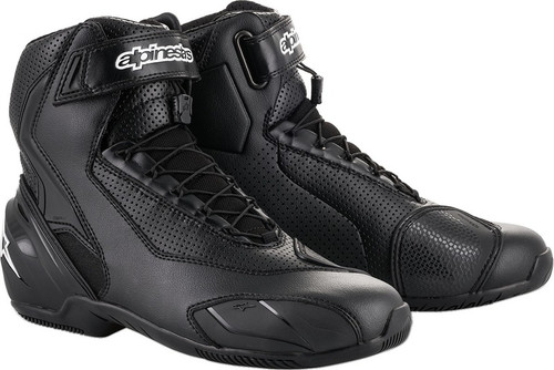 Microfiber upper Perforated microfiber panels on lateral and medial quarter areas plus medial side perforation zone for enhanced airflow Tongue is made with breathable mesh to improve airflow Rear accordion panel is lightweight padded material Speed lacing system derived from Alpinestars MotoGP technology for a quick, precise, secure closure Ankle opening closure system using a hook-and-loop strap with debossed Alpinestars logo Foam-backed double-density ankle disc guards mounted under the upper boot layer Thermoplastic Rubber (TPR) guards in key areas for impact resistance and flexibility External TPR toe reinforcement for abrasion resistance Welded reflective insert on rear improves visibility in low-light conditions Thermoplastic Polyurethane (TPU) heel counter guards against impacts and abrasion Internal toe box reinforcement layered under the shoe microfiber outer layer