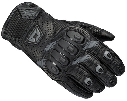 Genuine goat leather backhand and palm construction Leather palm and pinky overlays Perforated backhand, fingers, and thumb Pre-curved fingers for increased comfort Silicone-printed, anti-slip throttle guard on the palm TPU slider on heel of palm Accordion paneling across fingers, thumb and backhand TPU knuckle protector TPR finger knuckle protectors Neoprene cuff Hook and loop TPR closure Touchscreen compatible index finger and thumb