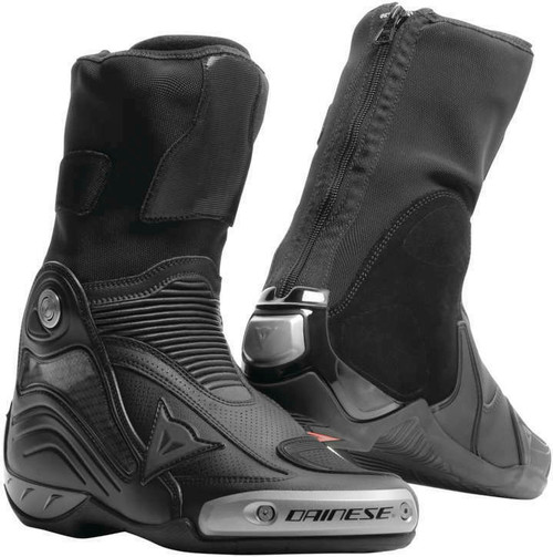 Axial D1 Air is the ventilated version of the most advanced Dainese racing boot, the same one that MotoGP™ riders race in. Its IN construction, designed for wearing the boot under the suit, allows for optimal integration between suit and boot for a safer, more tapered, and lighter whole. Velcro panels ensure that the garments join perfectly for greater protection against unwanted twisting of the ankle. Axial Distortion Control System is incorporated into the boot, an ankle movement brace consisting of a jointed carbon fiber structure that joins the inner boot liner to the shin protector. Axial Distortion Control System allows the joint to move as needed for riding a motorbike, but prevents any potentially harmful twisting or overextension. The rubber sole has been specially designed to ensure the best grip on the foot pegs in all conditions, while its compound is designed to offer maximum resistance to abrasion.