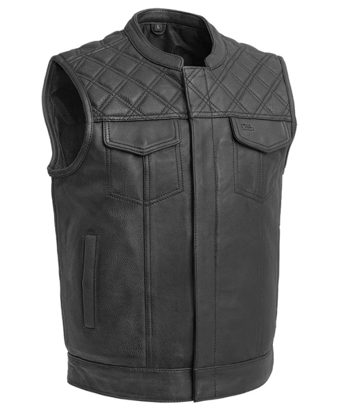1.00-1.1 mm Diamond Naked Cowhide. Club style with one inch collar, covered snaps and hidden cropped center zipper. Double diamond stitching on shoulder. White stitching. Two buttoned chest pockets. Two buttoned slash pockets. Satin Lining with Black background and White Paisley. Quick access concealed carry pocket on the left side. Interior concealed carry pocket on the right side. Interior cellphone pocket on left side. Easy access across the bottom for patches and embroideries. YKK zippers.
