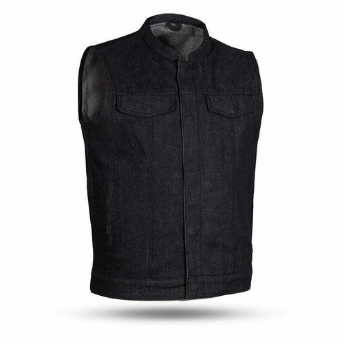The Kershaw is a club style vest in our Rough Neck Raw Denim. It's a club style vest with one inch banded collar and covered snaps. A cropped center zipper helps ensure the vest won't ride up while you're riding. Two conceal carry pockets, two chest pockets and two slash pockets for everything you need to carry. This one is unlined, and great for warmer weather or layering.