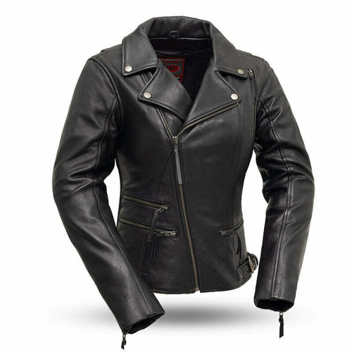 - Motorcycle style with snap down lapel, collar and asymmetrical zipper