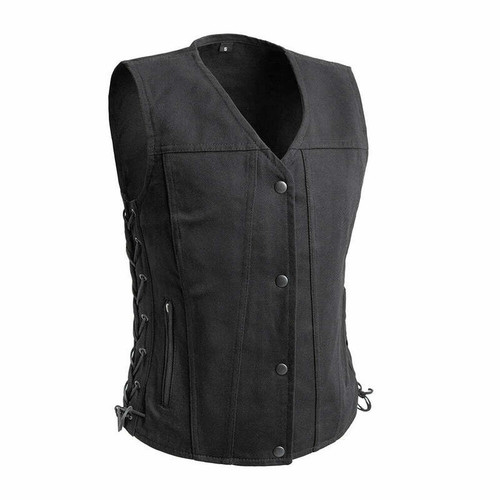 The Tiff is a womens lightweight vest with V-neck made in our lightweight black twill. This vest is perfect for warm days on the motorcycle. The side lacing provides an easy way to layer, or just get a little extra breathing room. The single panel back makes for an easy spot to add patches or embroideries. And it's available up to a size 5x!