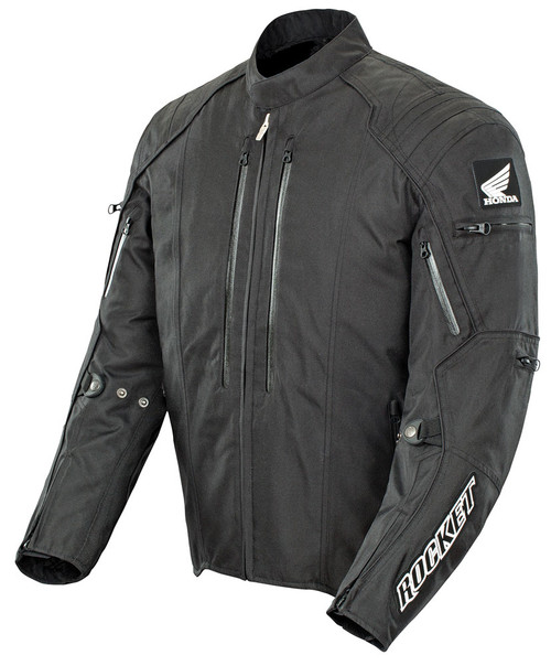 Waterproof treated Rock Tex 600 Outer Shell Externally accessible C.E. approved armor in shoulders and elbows Removable Spine Armor with Pocket for Optional C.E. Spine Protector Variable Flow ventilation system with waterproof zippers Cross Linked Ventilation with Wind Tunnel Cooling Patent Pending 6 point Sure Fit custom adjustment system Snap Loops for Attaching Jacket to Belt Removable insulated full sleeve liner Reflective stripe Official licensed Honda product