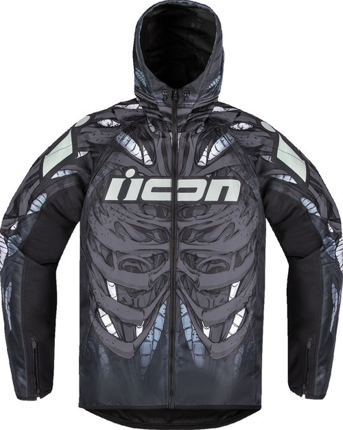 Airform Manik'r graphic on front and back of jacket 420D Polyester chassis with 300D Polyester internal reinforcement PU-Coated shell material with DWR finish D30 removable Viper back protector; elbow and shoulder impact protectors Bungee cord style drawstring hood AirFly center front mesh panel with chest and back zippered vents Vented cuff zippers