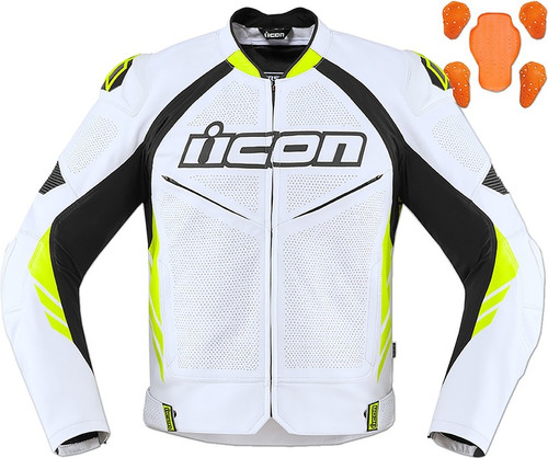 1.1-1.3mm TracSpec leather and textile, coupled with ICON's Attack Fit A full D3O impact protector package (elbow, shoulder, back) and the accordion leather flex zones Deep chest pockets that double as chest vents, reinforced perforation zones, retro-reflective hits, and a padded microfleece comfort liner collar For the throttle jockey, we've added an internal waist zipper that connects to the Hypersport Prime pant, perfect for track use. For sizing, please refer to the 2021 Helmet & Apparel catalog.