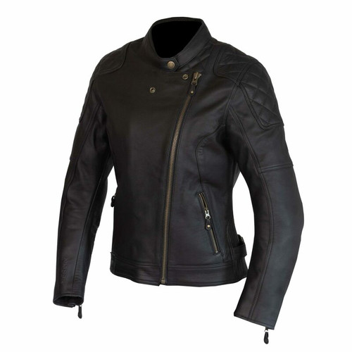 With a front asymmetrical zip, this is a British motorcycle classic cut to a flattering womens silhouette. Using a premium cowhide and D3O four-piece impact protectors, the Bristol jacket has been brought bang up to date. There are three colour optionsblack, distressed brown, and distressed greenand each colour comes with antique brass hardware in the Merlin branded snaps, YKK zippers, and metal buckle adjustments. Bristol has a supple and luxurious feel, enhanced by the diamond stitched quilt overlays to the shoulders and back.