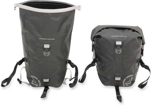 Constructed from heavy duty waterproof tarpaulin Durable heat welded seams Heavy-duty ITW quick release buckles Roll down top design creates waterproof seal Coated tarpaulin material is easy to spray and wipe clean Straps are adjustable via hook and loop to fit multiple bike seat widths Bags have quick disconnect buckles