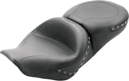 Wide bucket seat made especially for miles of comfort One-piece seat with marine grade fiberglass baseplate Seat nose narrower than stock so rider can plant feet on the ground Seat open in middle to accept driver backrest (sold separately) Naugahyde cover and trimmed with a skirt and black studs Made in the U.S.A.