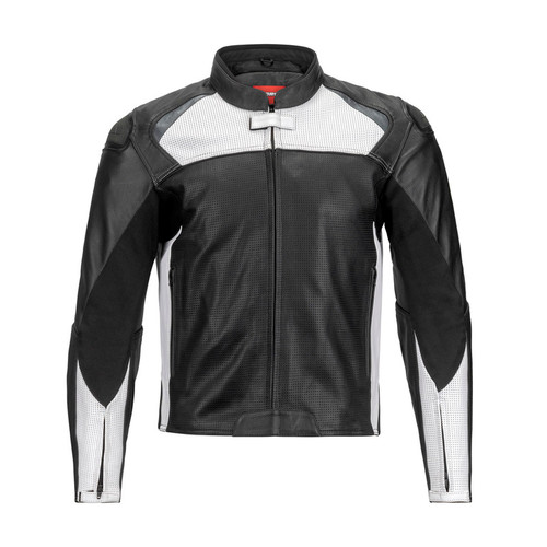Full grain 1.2mm cowhide leather construction with airflow punched front and back panels Quilted removable zip-out branded NORU vest liner Zip entry front pockets Mobile phone sleeve inside Chest slider pocket Airflow mesh inner lining TPU molded inset shoulder protection Leather stretch hip panels for increased movement Low profile collar with neoprene comfort padded trim and microfiber lining Short connecting zip for pants CE approved armor in shoulders and elbows
