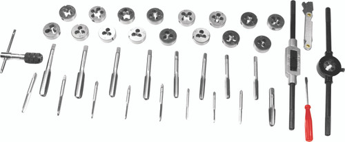 Includes: 17 taps and 17 dies (course/fine thread and NPT), T-handle tap wrench, tap/die holders, screw driver, pitch gauge and storage case.