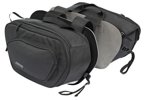 Wind and Water Resistant Heavy Duty Denier Construction Bag is fully expandable for greater capacity Bag maintains shape , has a lined interiorAttaches using velcro straps and quick release buckles Heat resistant bottom panels Side pockets for storing smaller items Protective material prevents slipping and marking Rain cover included Reflective logos Main compartment measures: 18.5 L X 7.5 W X 10.5 H Holds 23.87 Liters per side