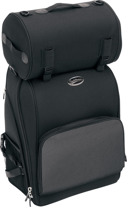 Sleek styling with full features Fully adjustable sissy bar mounting system goes on in seconds over any size and style sissy bar pad; once adjusted for your size pad, you never need to adjust it again Rigid construction holds bag shape even when empty R850 roll bag included for extra cargo capacity; top cargo straps mount included roll bag or strap on jacket, rain gear, etc. Top carry handle, backpack straps and shoulder strap for easy toting off bike Bottom pocket office organizer and lockable zipper pulls Constructed of UV-, water- and weather-resistant 1200-denier SaddleTuff and leather-like, maintenance-free SaddleHyde panels Built-in pocket with raincover