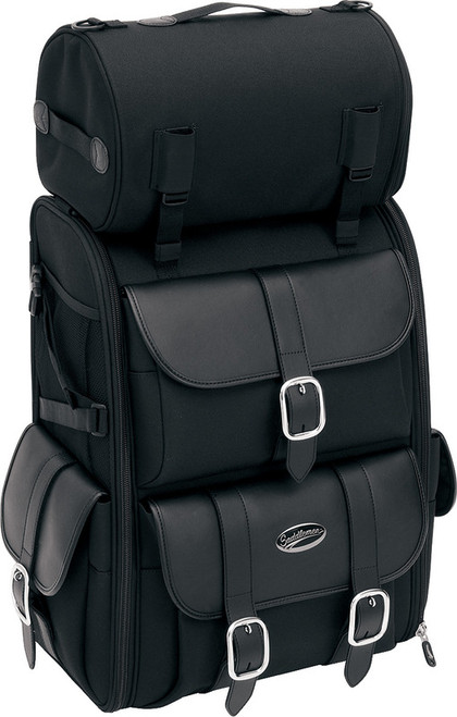 Big, full side openings allow easy access to bag contents while bag is still mounted on bike Fully adjustable sissy bar mounting system goes on in seconds over any size and style sissy bar pad; once adjusted for your size pad, you never need to adjust it again Rigid construction holds bag shape even when empty R850 roll bag included for extra cargo capacity; top cargo straps mount included roll bag or strap on jacket, rain gear, etc., and its separate mounting system allows independent installation on rack, seat or sissy bar Top carry handle, backpack straps and shoulder strap for easy toting off bike Top pocket office organizer and lockable zipper pulls Built-in pocket with raincover Constructed of UV-, water- and weather-resistant 1200-denier SaddleTuff and leather-like, maintenance-free SaddleHyde panels