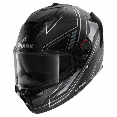 The aerodynamically-shaped SHARK Skin peak side fastenings not only enhance the helmet's aesthetics but also contribute to passive noise abatement, providing a quieter ride. The 2 air inlet/2 air extractors system, with an easy-to-use ON/OFF switch, optimizes airflow and ventilation for your comfort.
