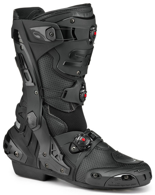 Discover the elegance and resilience of the Sidi Rex Air Boots, featuring an advanced closure system that offers both simplicity and speed in achieving the perfect fit. Equipped with 3 steel cable adjustable closures coupled with a TECNO-3 PUSH rotor, they ensure a secure yet comfortable fit, with the PUSH button facilitating increased closing pressure. The boots symmetrical shin and ankle mechanisms allow for a snug, balanced closure, making them an ideal companion for high-speed adventures and leisure rides alike.