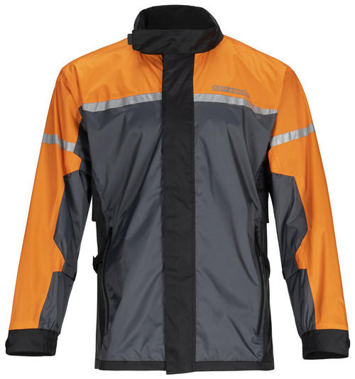 Motorcycle riders know that its not a matter of if, but when they will get caught in the rain. Be prepared with this waterproof and breathable jacket that features sealed seams. It includes a patented hood that easily fits under your helmet to prevent water from rolling off your helmet and down your neck. Fine-tune the fit on your arms and waist with the adjustable straps. Utilize the waterproof exterior storage pockets and internal storage pocket to keep your devices protected from the weather. Keep visible in poor conditions with the reflective elements.