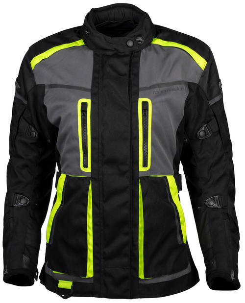Shell constructed using highly abrasion-resistant 600 denier Carbolex polyester fabric, 1680 denier ballistic polyester in the elbows Pipeline venting with pinch vents A total of 11 intake and exhaust vents for maximum air circulation Aqua-Barrier Under-The-Helmet hood to help eliminate seepage while riding Accordion stretch panels in the back and elbows Phoslite reflective protection Microfiber-lined collar and cuffs Adjustable sleeve take-up straps at forearm and bicep Newly designed CE-approved Armadillo armor in the elbow and shoulder, with revised articulated triple-density back protector Waterproof, breathable Rainguard barrier Removable thermal liner Zippered chest map pocket, fleece-lined hand warmer pockets, internal pouch, mobile media pocket, and dual zippered fanny pack Adjustable waist belts with TPR pulls