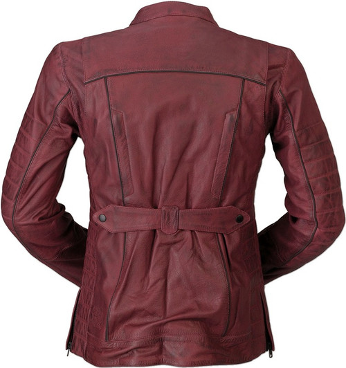 Milled merlot-colored leather .9-1mm Satin inner liner Chest, back and arm vents for max airflow Two handwarmer pockets One conceal-and-carry pocket Adjustable metal snap wrist closure Black reflective piping