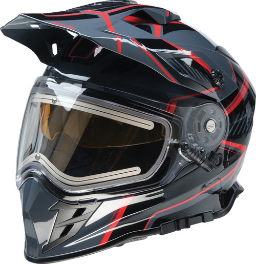 Injection ABS shell Includes dual pane anti-fog electric shield and standard shield Versatile design can be used with or without face shield (hardware for conversion included) Fully removable polyester moisture wicking lining and cheek pads Removable breath box and chin curtain included Micrometric helmet strap Amber color drop-down sun visor activated using lever on the side of the helmet